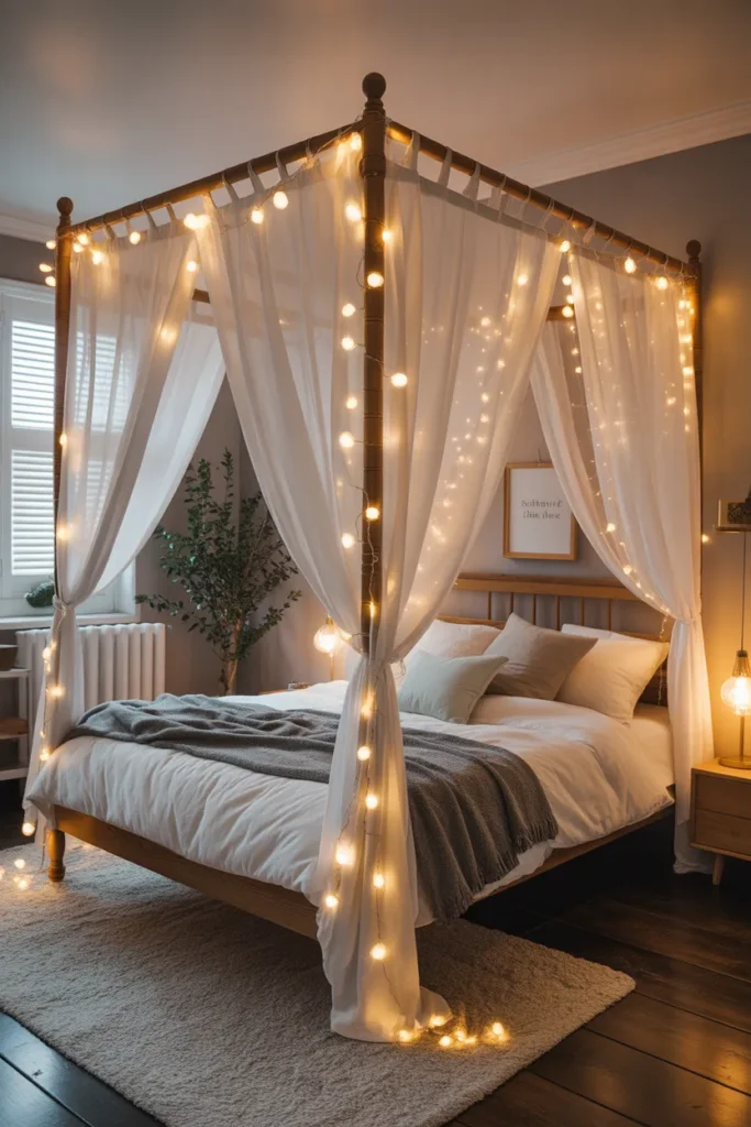 Who wouldn’t want to climb into bed under a canopy of soft, twinkly lights? It feels like you’ve stepped straight into a Pinterest board after just one scroll. Simply string the lights along curtain rods above your bed and let them cascade down. It becomes this dreamy little sanctuary where you can escape the world, wrapped up in velvet throw blankets while sipping herbal tea.